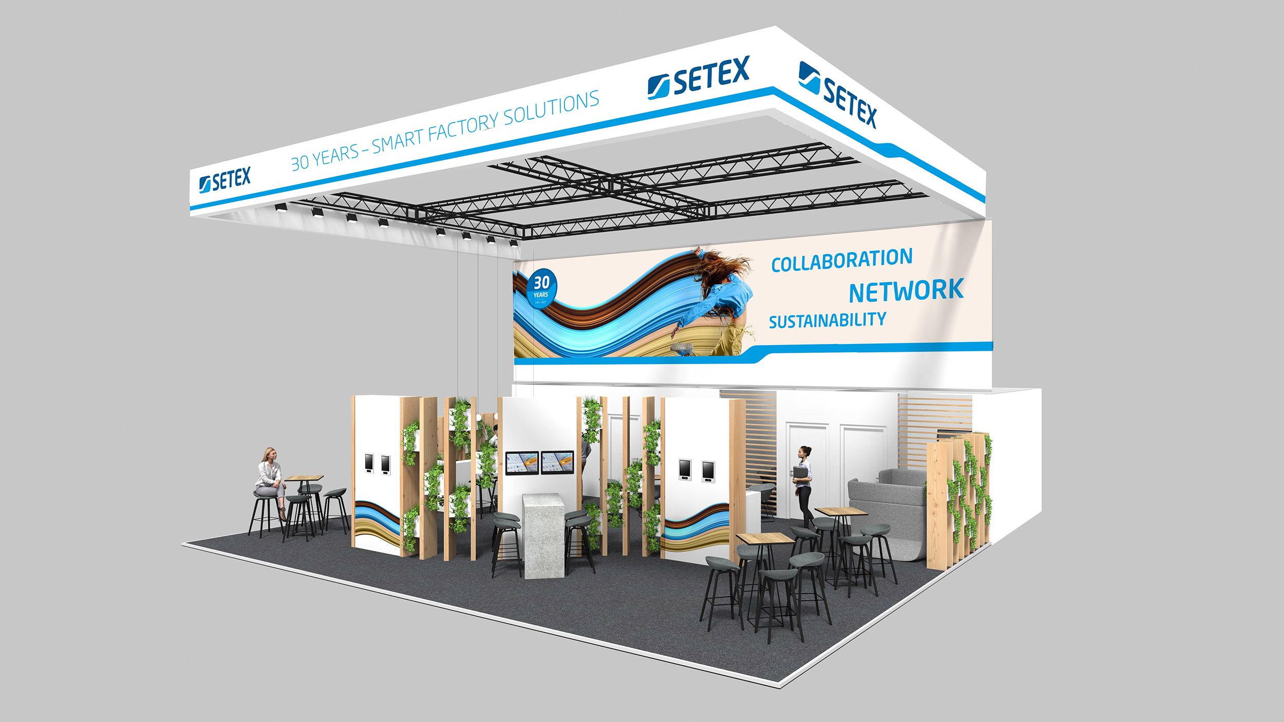 Bereits zum dritten Mal seit 2015 entwickeln wir für SETEX ein Messestandkonzept: Die Standfläche erhält einen großzügigen, offenen Präsentationsbereich sowie offene Besprechungsräume. Durch die Verwendung von rohem Nadelholz und Pflanzen wird das Thema Nachhaltigkeit in den Mittelpunkt gerückt. Alle sichtbaren Präsentationsflächen werden CI-konform gestaltet. Mit der großen Botschaft 30 Jahre — Smart Factory Solutions” feiert SETEX sein Firmenjubiläum und zeigt, dass es eine durchgängige Komplettlösung für die gesamte Textilproduktion bietet. Das passende Keyvisual steht für Bewegung und sorgt über die Fernwirkung in der Messehalle für einen Besuch des Messestandes.